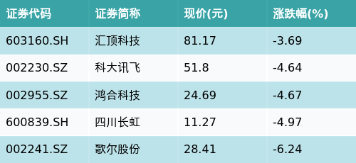 截至收盘,语音技术主题涨跌幅最高的五只股票为:汇顶科技(603160.SH)、科大讯飞(002230.SZ)、鸿合科技(002955.SZ)、四川长虹(600839.SH)与歌尔股份(002241.SZ)。详情见下表: