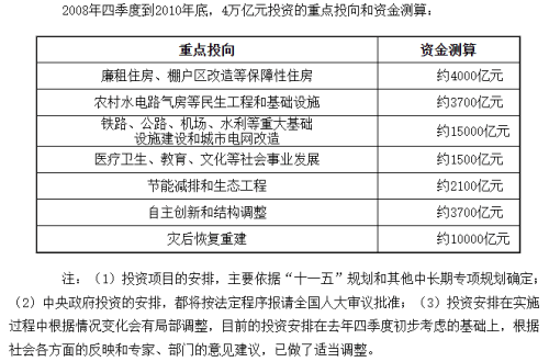中国政府于2008年11月推出了为期两年规模高达4万亿元的一揽子刺激措施。其核心是鼓励和支持地方政府进行基础设施投资。当时政府的指导思想是“出手要快、出拳要重。特别要防止出现因出手慢、出拳不够重,信心下滑后难以遏制的现象。”【4】