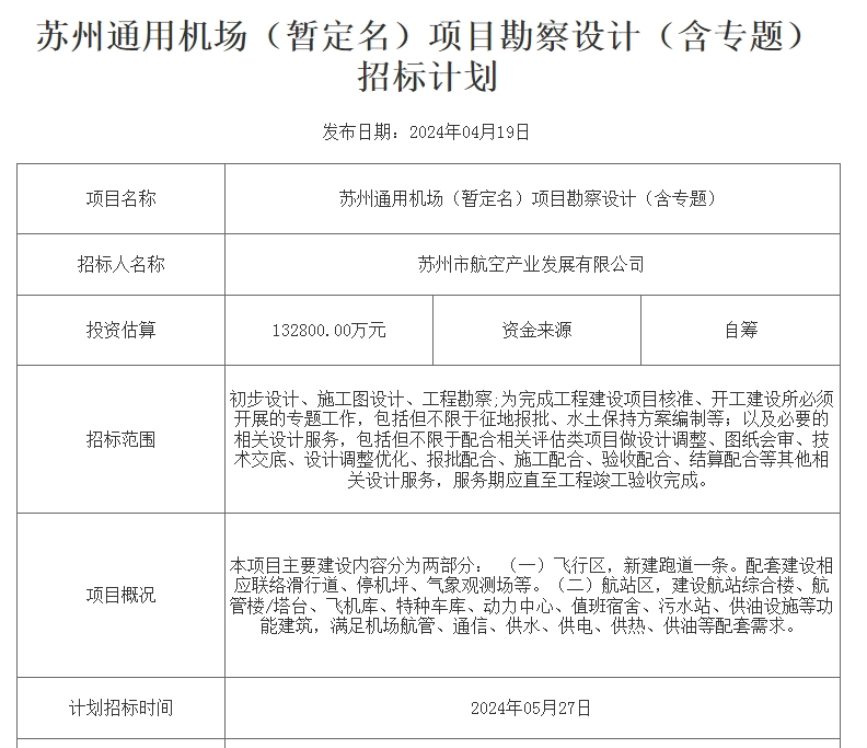 苏州市公共资源交易平台近日公布了苏州通用机场(暂定名)项目勘察设计(含专题)招标计划。根据招标公告,项目总投资132800.00万元。预计5月27日启动招标。